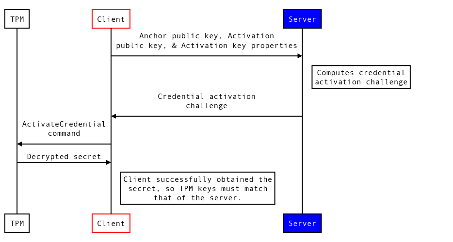 Credential activation allows a remote party to verify one key is on the same TPM as another key, and that the key has a specific set of properties.