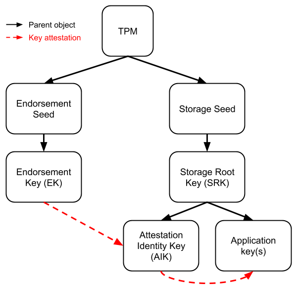 - 比如 Attestation Key(AK)或应用密钥,都是在 TPM 的存储体系下生成的;