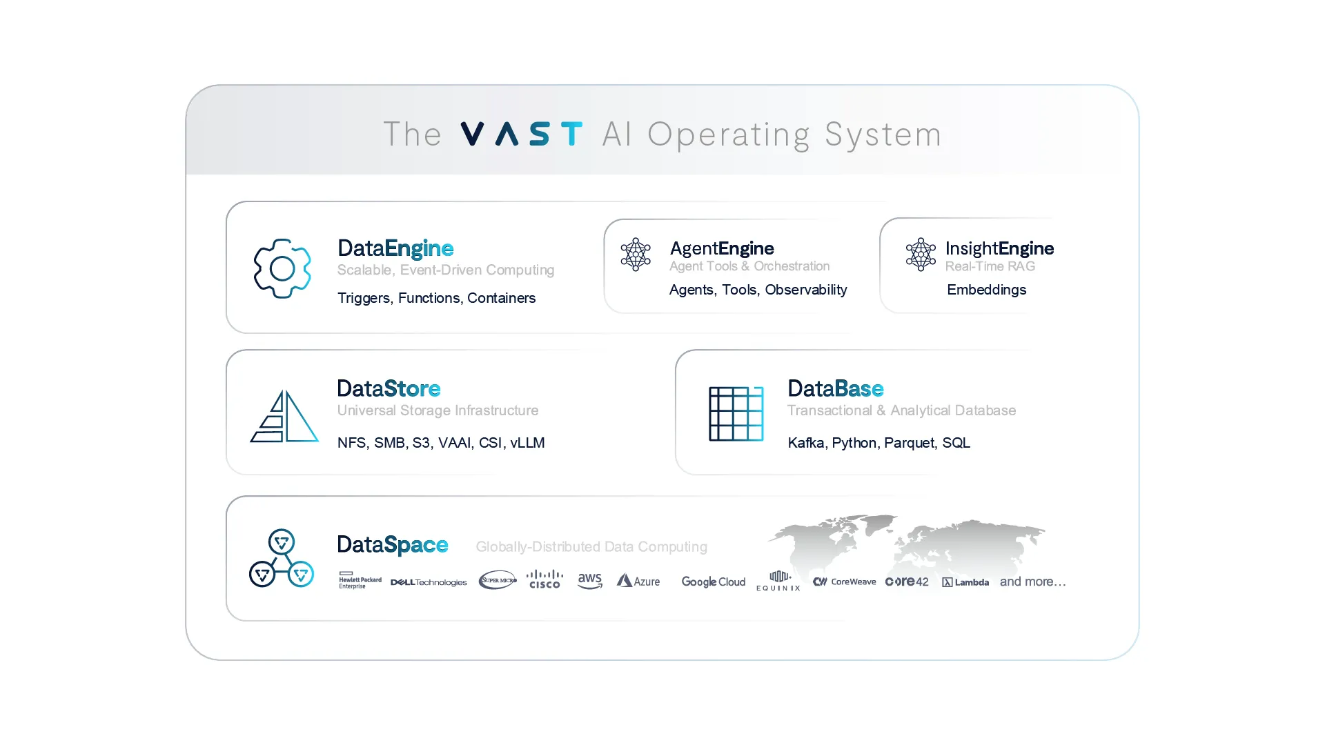 - VAST DataSpace 将这一硬件环境向外扩展,实现全球范围内的存储与计算联邦化